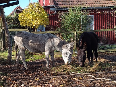 | Bei unseren Eseln wächst nun langsam das Winterfell. Noch bekommen sie jeden Morgen frisch gemähtes Gras als Futter. | |