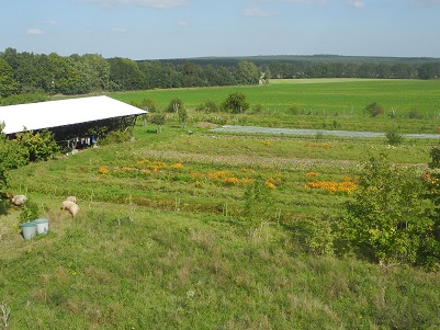 Vom großen Birnbaum bietet sich ein schöner Blick über die Gemüsebeete, die nach erstem Bodenfrost schon einige Brauntöne zeigen. Das Orange-Gelb der Tagetes strahlt jedoch noch immer. | |||